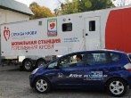 Представитель автоклуба на фоне мобильного комплекса заготовки крови
