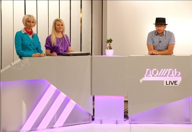 Ведущий Алексей Суханов, Татьяна Шахнес и Софья Малявина в студии ДОЖДЯ.