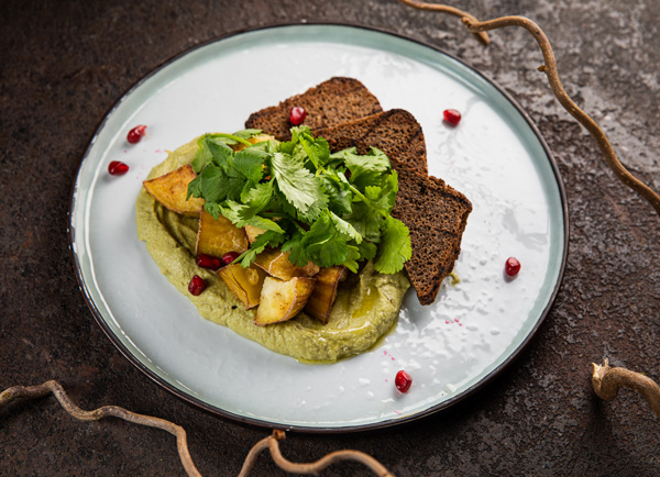 Выкладываем на тарелку полученное пюре, сверху выкладываем обжаренный баклажан. Посыпаем листьями оставшейся кинзы, украшаем зернами граната. Подаем с бородинским хлебом.