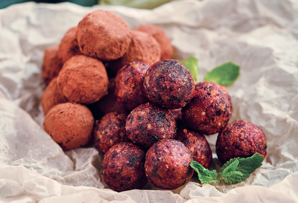Конфеты №1: Банан, кешью и грецкий орех пропустить через мясорубку. Скатайте примерно 10 шариков и обваляйте их в какао-порошке или кэробе.