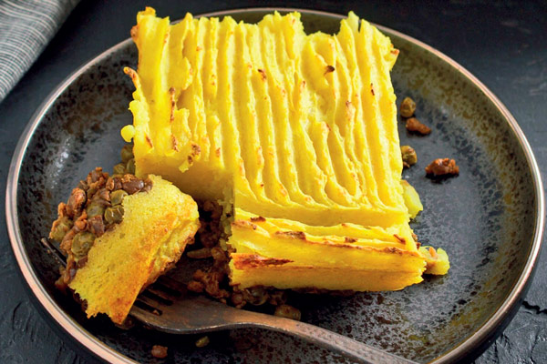 В форму для выпечки выложить начинку из соевого фарша, равномерно ее распределить. Сверху выложить картофельно-капустное пюре, разровнять его лопаткой и вилкой нарисовать узоры.
