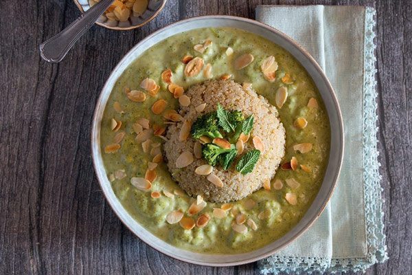 Выложить в тарелку киноа с помощью кулинарного кольца, вокруг налить крем-суп. Подавать с миндальными хлопьями.