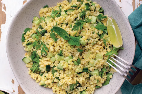 Это блюдо может похвастаться на редкость необычным сочетанием вкусов. Необычным и аппетитным. Причем приготовить его можно и с кускусом, и с рисом, принцип один и тот же: крупа отваривается так, чтобы еще оставалась упругой, растирается вручную с цедрой лайма и солью, а потом добавляется большое количество зелени и мелко нарезанный огурец. За счет мяты и огурца вкус получается очень «освежающим». Такой булгур я люблю подавать самостоятельно в жаркий летний день или в качестве гарнира к белой рыбе или индейке. Я бы назвала это блюдо лимонадом среди круп!