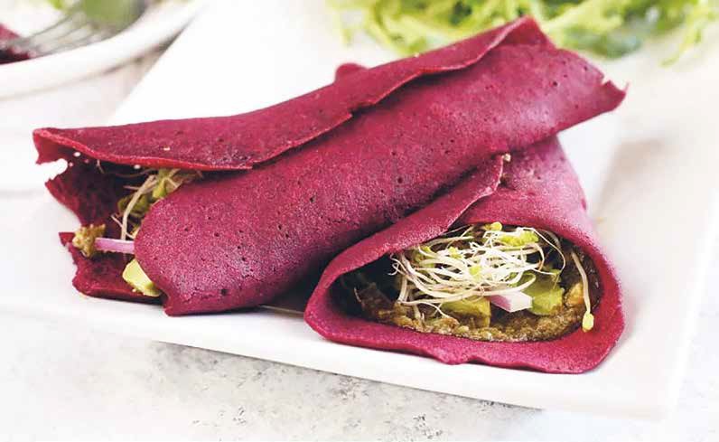 Ингредиенты для теста: 150 мл свекольного сока 1 яйцо 110 г гречневой муки 1/2 чайной ложки молотого чеснока 1/2 чайной ложки молотого черного перца 1/2 чайной ложки соли 2 столовые ложки топленого кокосового масла Для начинки: 1 столовая ложка кокосового масла 1 очищенное и нарезанное авокадо 1/2 красного лука Зелень: молотый черный перец, красный перец хлопьями Для соуса песто: 30 г кресс-салата 15 г базилика 15 г свежей петрушки 1/2 чайной ложки лимонного сока 5 измельченных зубчиков чеснока Сначала приготовьте соус песто. Для этого смешайте все его ингредиенты и измельчите их в блендере до нужной консистенции, добавив в процессе 2–3 столовые ложки воды. Уберите соус в холодильник. Теперь займитесь тестом. Для этого взбейте яйцо со свекольным соком, добавьте гречневую муку, чеснок, черный перец и соль. Смешайте все ингредиенты, медленно влейте в них растопленное кокосовое масло и воду. Взбивайте, пока смесь не станет однородной. Дайте тесту постоять при комнатной температуре в течение 15 минут. Разогрейте сковороду на среднем огне и растопите кокосовое масло. Выпекайте блинчики по 1–2 минуты с каждой стороны. Готовые блинчики смажьте слоем песто, сверху выложите кусочки авокадо, красный лук и микрозелень. Посыпьте молотым черным перцем и хлопьями красного перца. Благодарим издательство «ХлебСоль» за предоставленный рецепт из книги Юлии Бордовских «Витамин L. Жизнь с позиции любви»