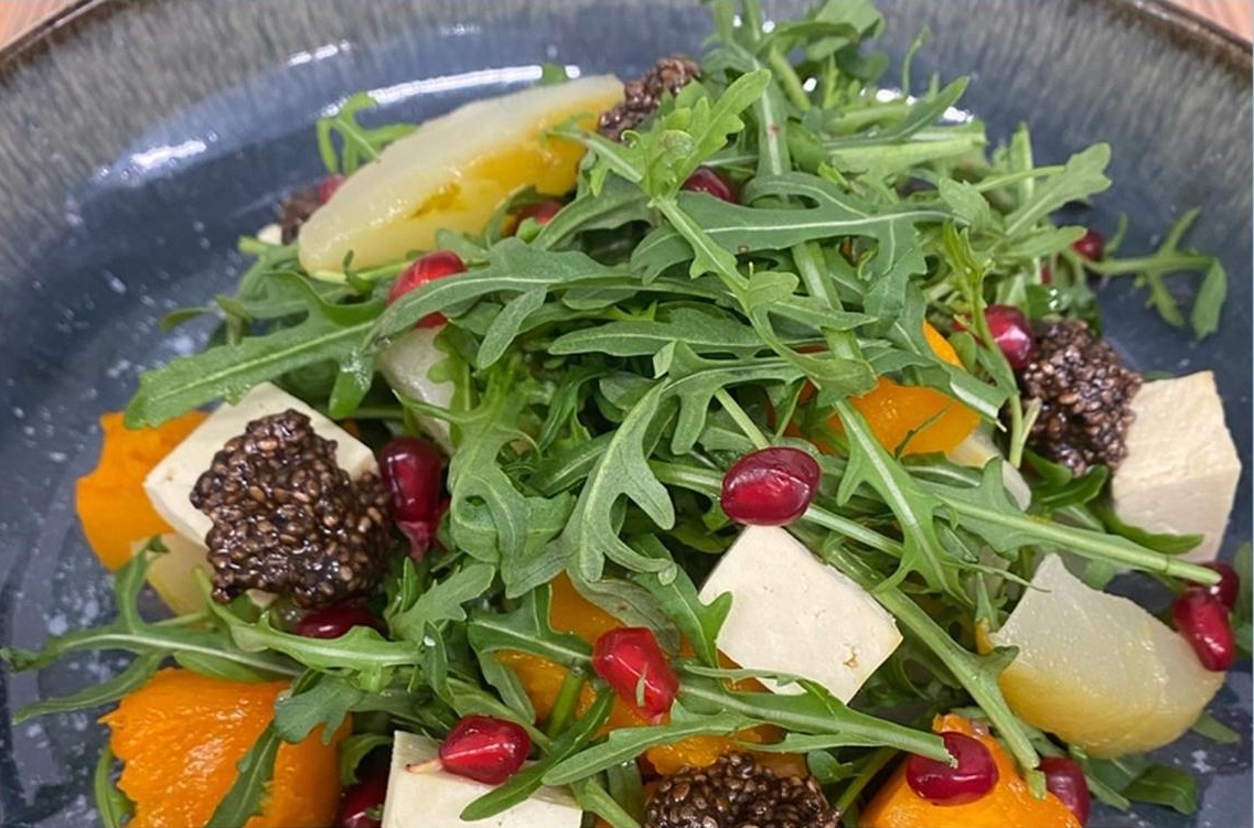 Лёгкое и яркое блюдо, которое зарядит энергией и станет отличным выбором накануне донации. Что нужно: • тыква — 100 г • груша — 2 шт • сыр тофу — 50 г • рукола — 30 г • гранат — 20 г • семена чиа — 5 г (для украшения, использовать можно после донации) Как готовить: 1. Тыкву очистить, нарезать кусочками, завернуть в фольгу и запечь в духовке при 180 °C 20–25 минут. 2. Груши запечь в кожуре без фольги до мягкости. 3. Одну грушу очистить и порезать дольками, вторую — превратить в пюре с помощью блендера. 4. Сыр тофу нарезать кубиками. 5. Семена чиа заранее залить водой и оставить в холодильнике на ночь. Сборка: На тарелку выложить кусочки тыквы, груши и тофу, сверху полить грушевым пюре. Добавить горкой руколу и украсить гранатом. Лёгкий, витаминный и яркий салат станет отличным дополнением к донорскому рациону!